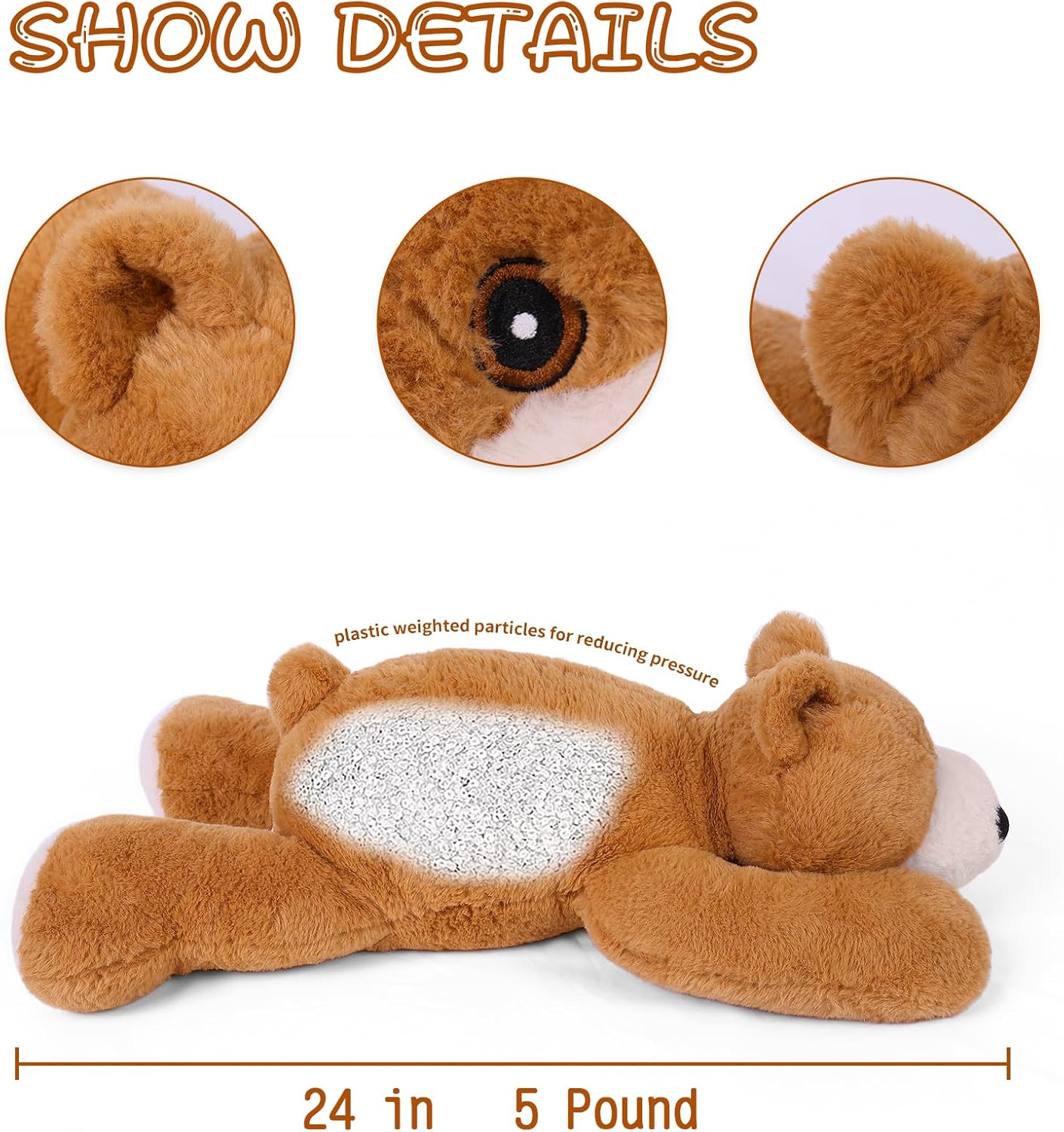 Unique Design: Our brown bear weighted plush animal is 23.6 in long, 5 lbs in weight. Embroidered eyes, a large nose and lovely ears make the bear toy looks even cute and safe. It will become your best friend to accompany your studying, watching TV and adventures.